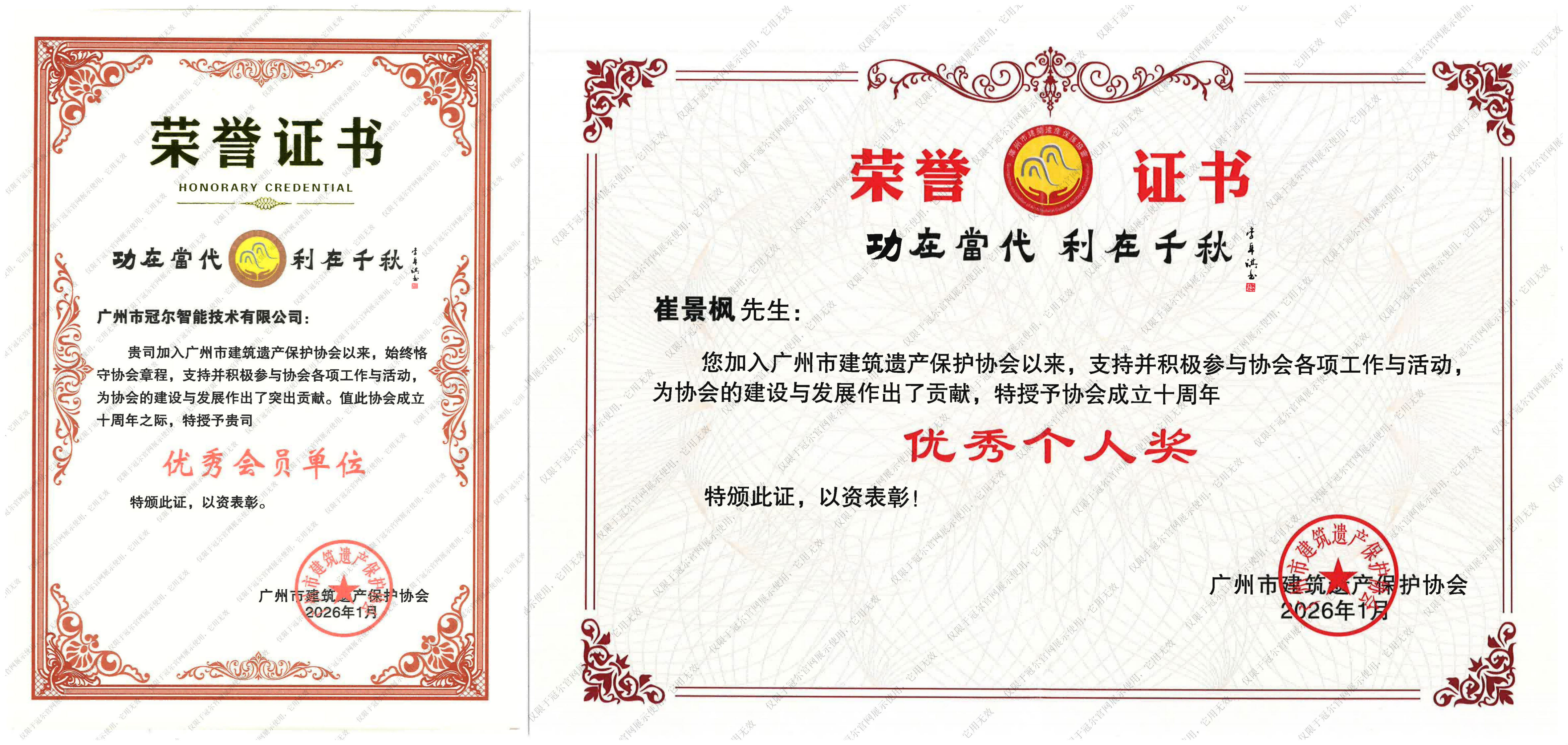 近日,在广州市建筑遗产保护协会成立十周年之际,冠尔智能及我司崔景枫先生分别被授予"优秀会员单位"和"优秀个人奖",以表彰我司及员工长期以来恪守协会章程、积极参与协会各项工作与活动,为协会的建设与发展作出的突出贡献。